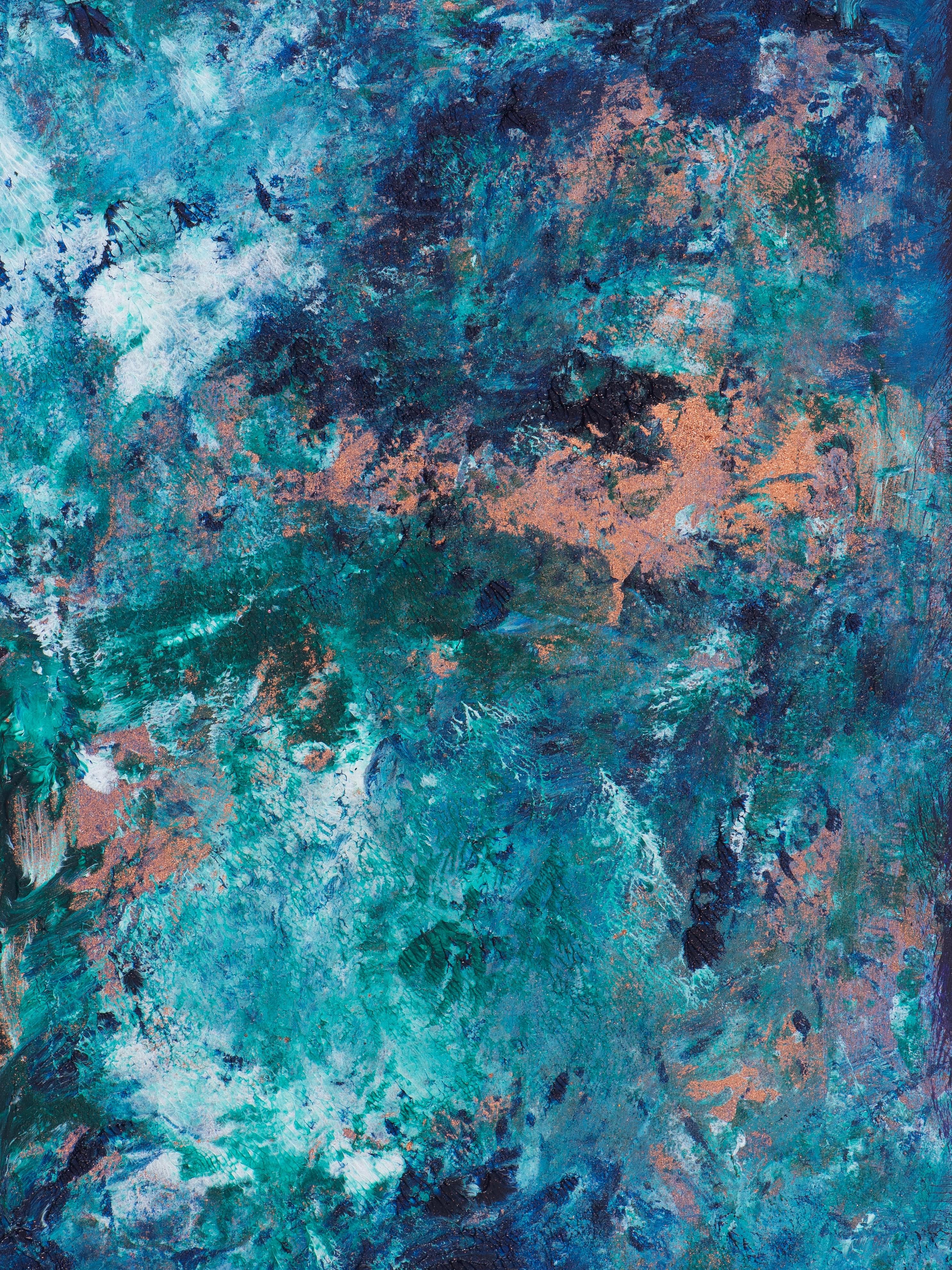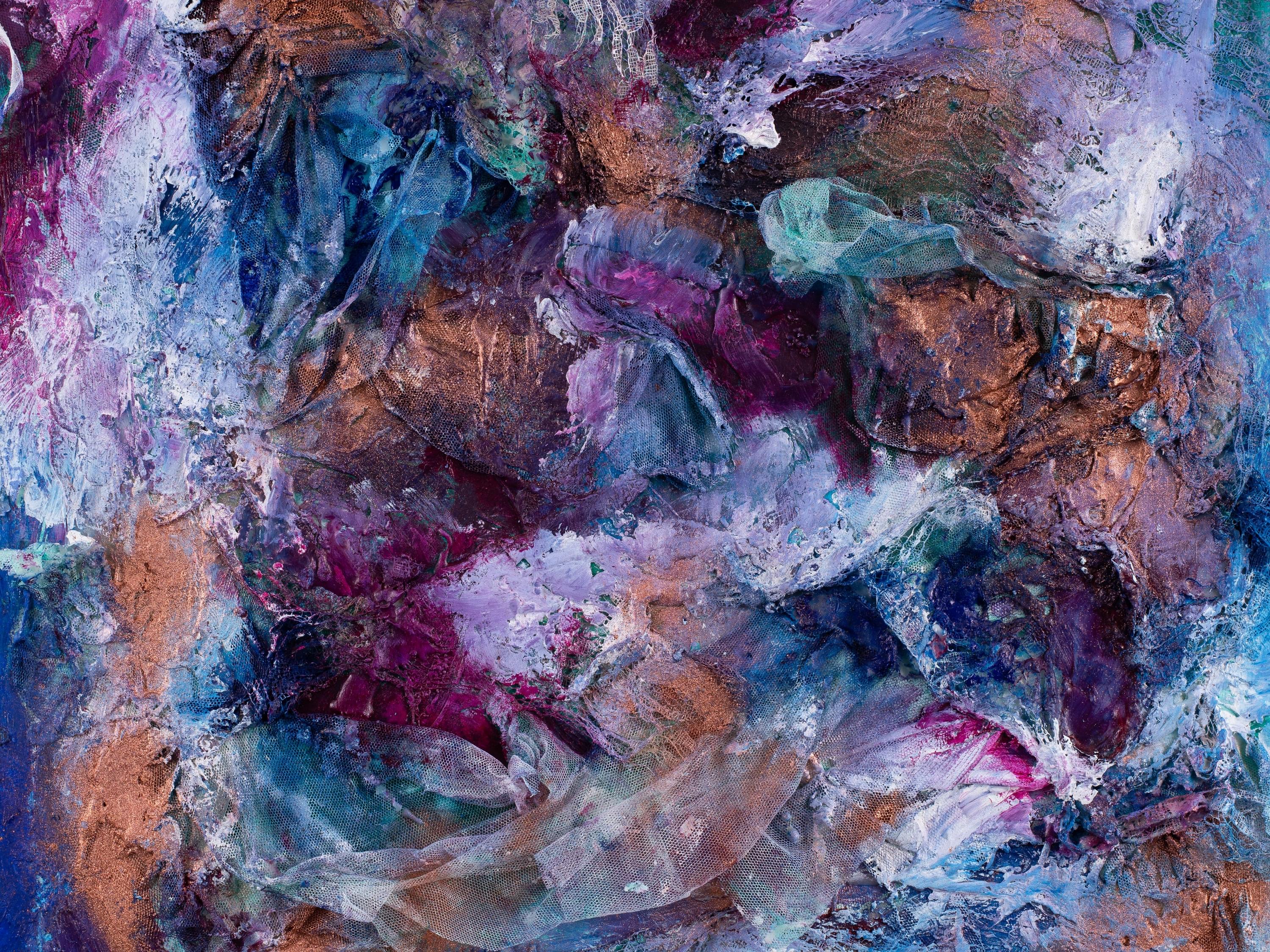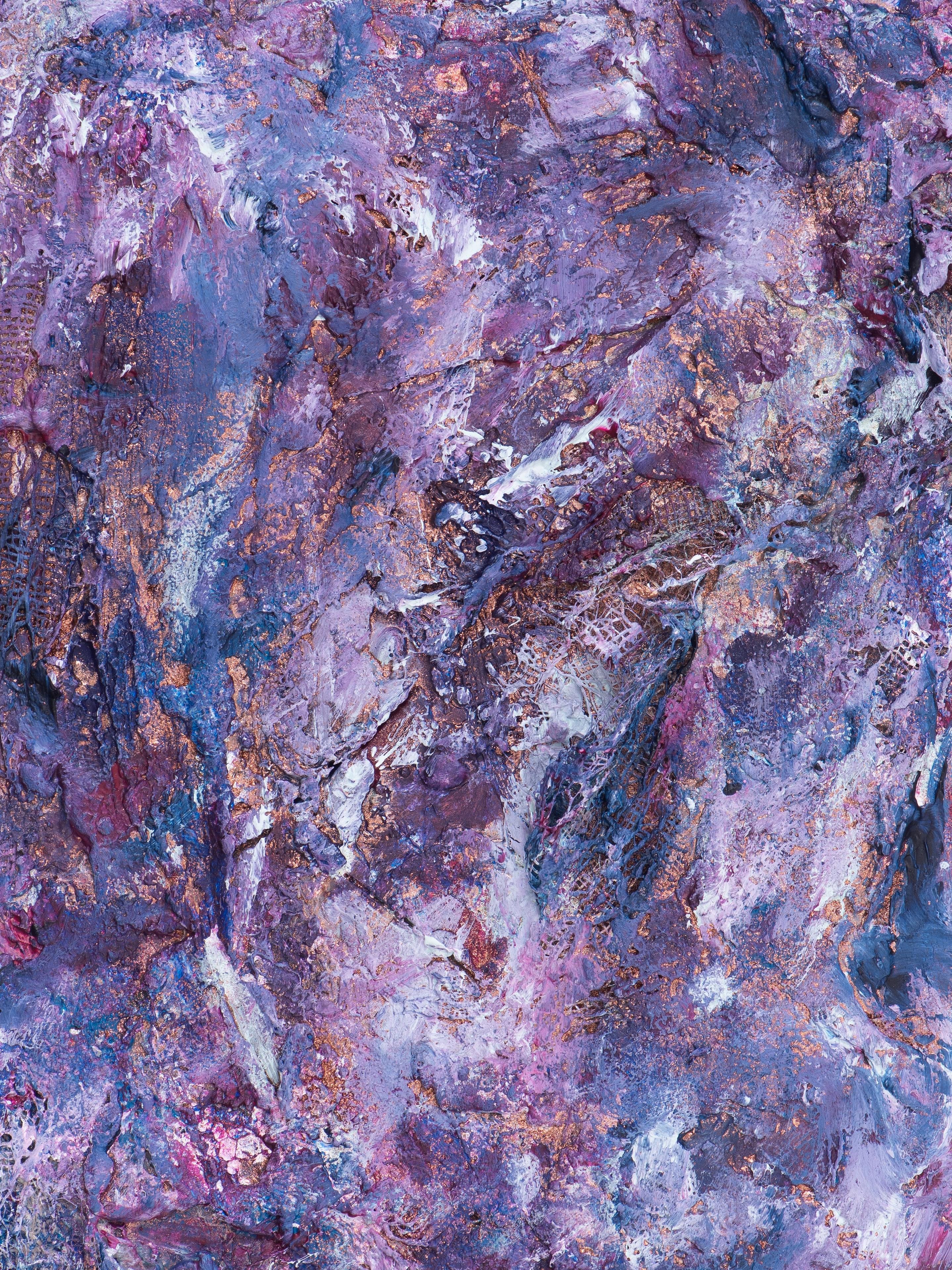 Homeward draws inspiration from the kaleidoscope of colours and textures present in the flora of the New Forest. From the russet reds of tree bark to the dusky blues and purples of spring's woodland flowers, each of the cast of characters of a life in lockdown gets its chance to take centre stage, intermingling with textured elements and multi-layered media.