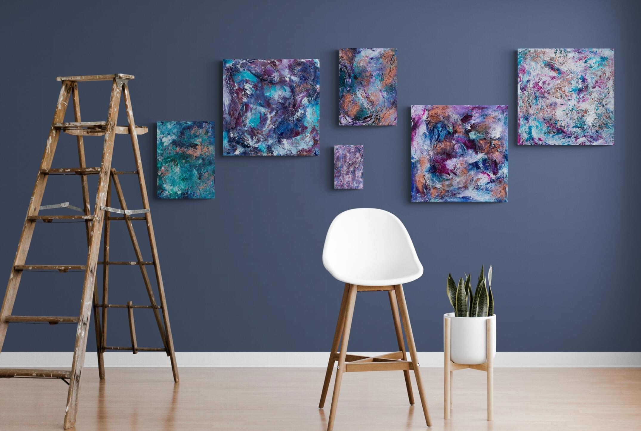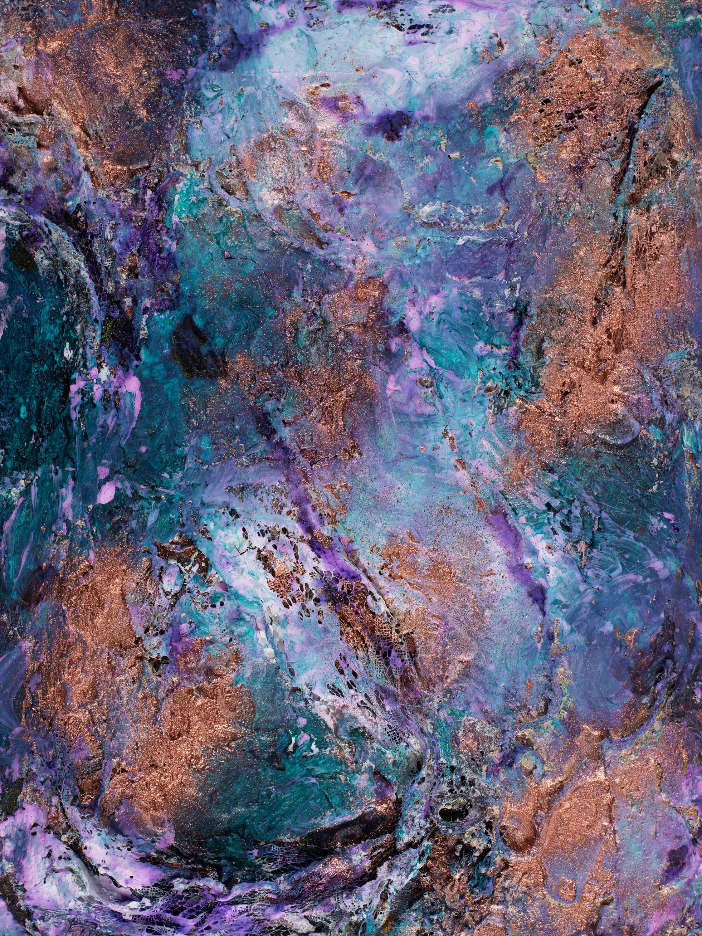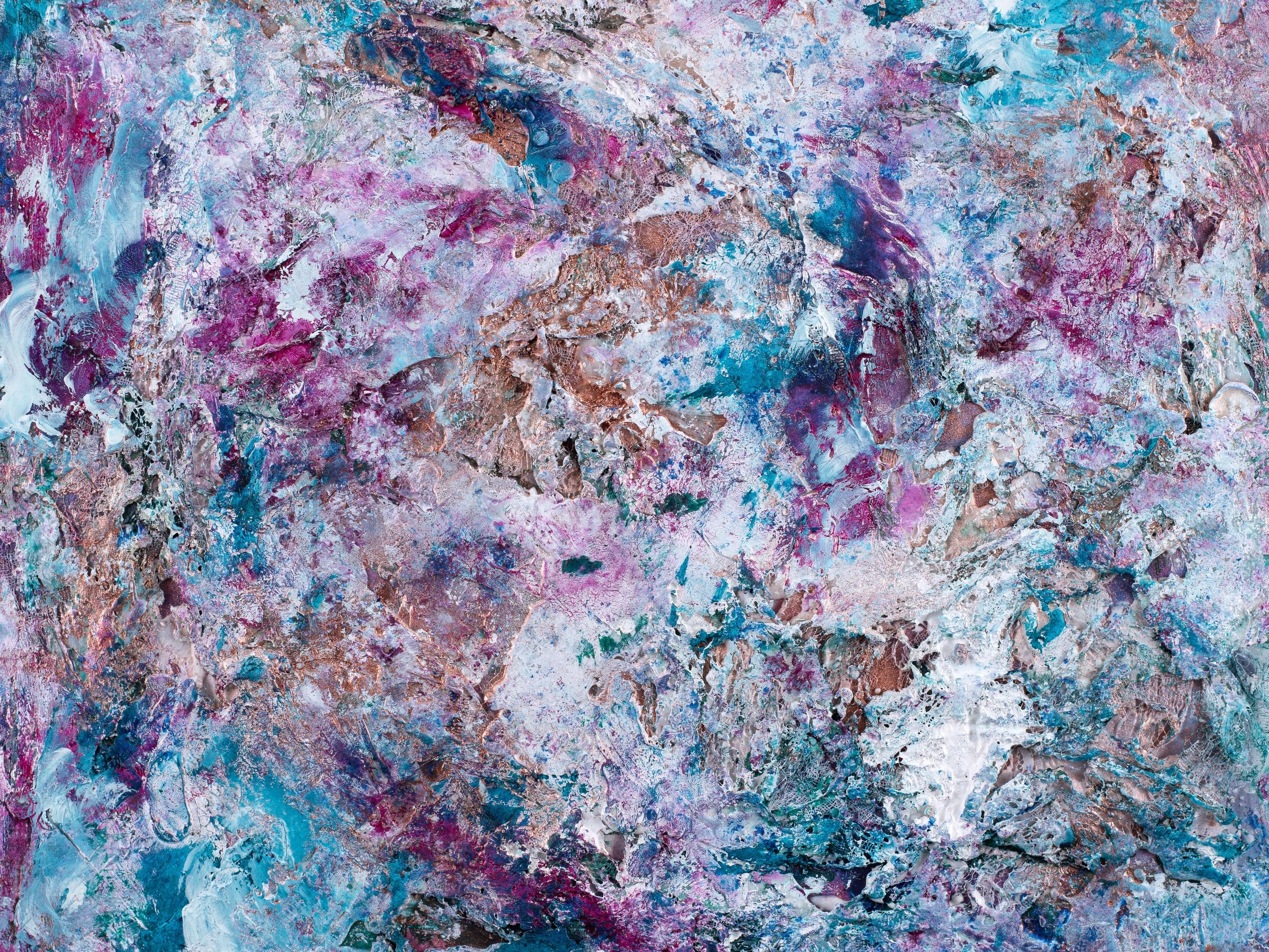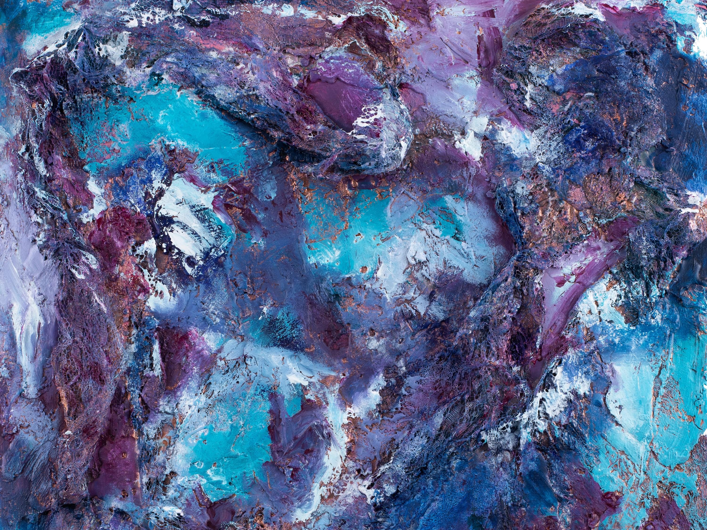 Homeward draws inspiration from the kaleidoscope of colours and textures present in the flora of the New Forest. From the russet reds of tree bark to the dusky blues and purples of spring's woodland flowers, each of the cast of characters of a life in lockdown gets its chance to take centre stage, intermingling with textured elements and multi-layered media.